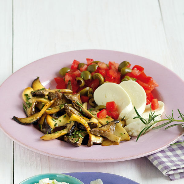 4 El Olivenl in einer groen Pfanne erhitzen und die Pilze und Kirschtomaten darin bei mittlerer Hitze ca. 2 EL Bratl 7-10 Minuten lang knusprig braun braten. Fr die Pilzpfanne Soe.